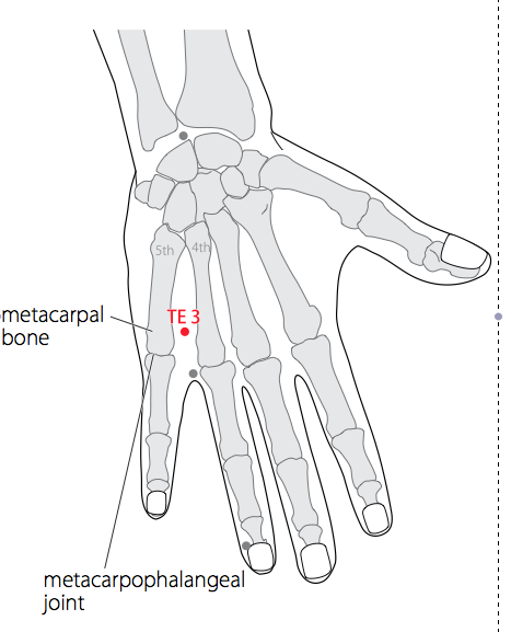 - Deng 1993 : 1) “Dans la dépression située en arrière de l'articulation métacarpo-phalangienne.” ( Ling Shu ) ; 2) “Dans la dépression située entre le quatrième et le cinquième métacarpien.” ( Jia Yi ) ; 3) “Dans la dépression située entre le quatrième et le cinquième métacarpien, à 1 cun au-dessus de Yemen ( 2TR ).” (Ju Ying) ; 4) “Dans la dépression située à 0,5 cun en arrière des articulations métacarpo-phalangiennes de l'annulaire et de l'auriculaire”. (Liu Ji) ; 5) “Dans la dépression située à 1 cun au-dessus de Yemen ( 2TR ).” (Jin Pan). Remarque : “En arrière de l'articulation métacarpo-phalangienne” ou “à 1 cun en arrière de la base des doigts ou de Yemen ( 2TR )” correspond à l’indication : “Dans la dépression située sur le dos de la main entre le quatrième et le cinquième métacarpien”. Liu Ji précise que le point se trouve “à 0,5 cun en arrière de l'articulation métacarpo-phalangienne”. La distance entre Yemen ( 2TR ) et Zhongzhu (3TR) doit être déterminée en fonction de l'articulation métacarpophalangienne. Elle est trop longue si on ajoute 0,5 cun. Actuellement, on situe ce point sur le dos de la main, en arrière de l'articulation métacarpo-phalangienne de l'annulaire, et dans la dépression qui se forme entre le quatrième et le cinquième métacarpien.