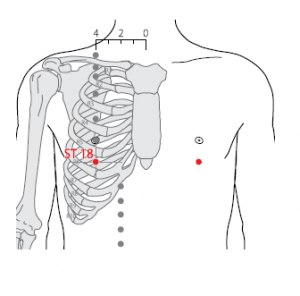 - WHO 2009 : In the anterior thoracic region, in the fifth intercostal space, 4 B-cun lateral to the anterior median line. Note: In males, ST18 is located at the intersection of nipple line and the fifth intercostal space. In females, ST18 is located at the midpoint of the inferior crease of the breast.