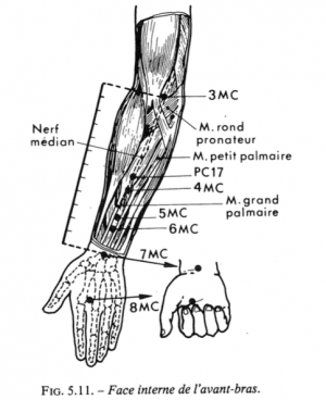 - Roustan 1979 : Au milieu du pli du coude, en dedans du tendon du biceps. (fig. 5-11).