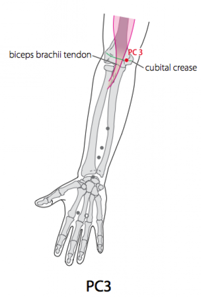 Note: When the elbow is flexed at 45 degrees, PC3 is located medial to the biceps brachii tendon.