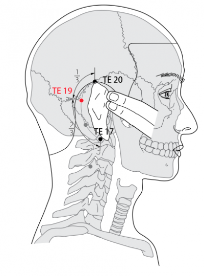 - Laurent 2000: sur la tête, en arrière du pavillon de l'oreille, aux deux tiers supérieurs d'une ligne courbe qui relie yifeng 17SJ à jiaosun 20 SJ (sommet de l'oreille) le long de l'hélix.
