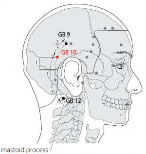- WHO 2009: On the head, posterosuperior to the mastoid process, at the junction of the upper one third and lower two thirds of the curved line from GB9 to GB12. Note: Posterior to the auricular apex, 1 B-cun superior to the hairline.
