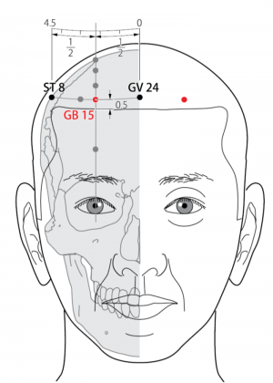 - WHO 2009: On the head, 0.5 B-cun within the anterior hairline, directly superior to the centre of the pupil. Note: When looking straight ahead, GB15 is superior to the centre of the pupil, at the midpoint of the curved line from GV24 to ST8.