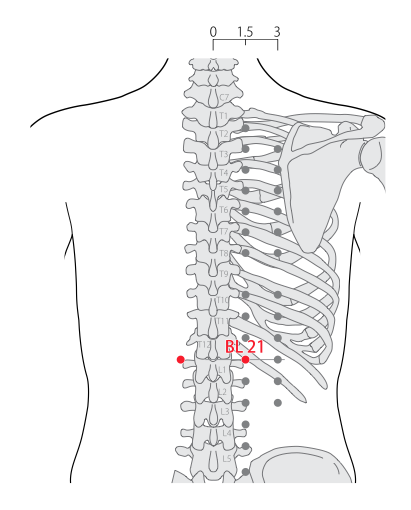 • WHO 2009: In the upper back region, at the same level as the inferior border of the spinous process of the 12th thoracic vertebra (T12), 1.5 B- cun lateral to the posterior median line.