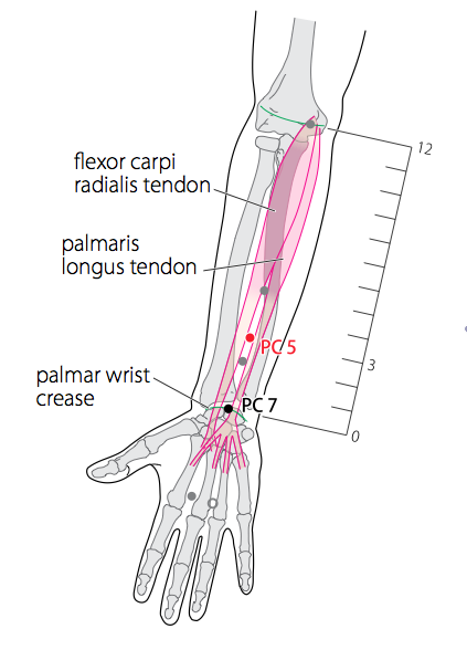 - WHO 2009 : On the anterior aspect of the forearm, between the tendons of the palmaris longus and the flexor carpi radialis, 3 B-cun proximal to the palmar wrist crease. Note 1: With the fist clenched, the wrist supinated and the elbow slightly flexed, the two tendons become more prominent. PC5 is located 3 B-cun proximal to PC7. Note 2: If the palmaris longus tendon is not present, PC5 is medial to the flexor carpi radialis tendon.