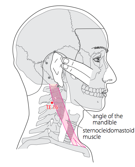 - Deng 1993 : 1) “antre les muscles du cou, au-dessus de quepen ( 12E ), en arrière de tianrong ( 17IG ), en avant de tianzhu ( 10V ), en arrière de Wangu (VB12), au-dessus de la ligne de plantation des cheveux.” ( Jia Yi ) ; 2) “Au-dessus du creux sus-claviculaire et des muscles du cou, en arrière de tianrong ( 17IG ) et de Wangu ( 12VB ), en avant de tianzhu ( 16V ), dans la dépression située à 1 cun au-dessus de la ligne de plantation des cheveux.” ( Sheng Hui ) ; 3) “A l'extérieur du grand muscle du cou, au-dessus de quepen ( 12E ), en arrière de tianchuang ( 16IG ), en avant de tianzhu ( 10V ), au-dessous,de Wangu ( 12VB ), au-dessus de la ligne de plantation des cheveux.” (Fa Hui) ; 4) “A 1 cun environ au-dessus de la ligne de plantation des cheveux, au-dessous de Yifeng ( 17TR ), sur le muscle de la mâchoire, ou à 7,5 cun environ de la pomme d'Adam.” ( Xun Jing ) ; 5) “En haut de Tianliao ( 15TR ), au-dessus de quepen ( 12E ) et à l'extérieur du grand muscle du cou, en arrière de tianrong ( 17IG ) sur le méridien taiyang de la main, en avant de tianzhu ( 10V ) sur le méridien taiyang du pied, au-dessous de Wangu ( 12VB ) sur le Méridien de la vésicule biliaire Shaoyang du pied, à la diagonale de la ligne de plantation des cheveux, à 1 cun en arrière de l'oreille.” (Jin han) ; 6) “A 1 cun au-dessous de fengchi ( 20VB ) et légèrement en dehors de celui-ci.” (Ji Cheng). Remarque: “Entre les muscles du cou” correspond à l'espace qui se trouve entre le muscle sterno-cléido-mastoïdien et le muscle trapèze. “En arrière de Wangu” ( 12VB ) (ou “au-dessous de Wangu” dans Fa Hui) signifie que ce point est situé directement au-dessous de Wangu ( 12VB ), c'est-à-dire en arrière et en-dessous de l'apophyse mastoïde, en arrière de tianrong ( 17IG ) et en avant de tianzhu ( 10V ). C'est cette définition qui prévaut de nos jours et on situe donc Tianyou (16TR) sur le côté du cou, directement au-dessous du bord postérieur de l'apophyse mastoïde, au niveau de l'angle de la mâchoire, sur le bord postérieur du muscle sterno-cléido-mastoïdien. “A 1 cun au-dessus de la ligne de plantation des cheveux” ou “à 1 cun environ au-dessus de la ligne de plantation des cheveux”, définitions que l'on trouve dans Sheng Hui , Xun Jing , etc., ne constituent pas des indications correctes parce qu'elles situent le point au-dessus de Wangu ( 12VB ). La localisation définie dans Jin Jian et Ji Cheng est semblable à celle de Jia Yi .