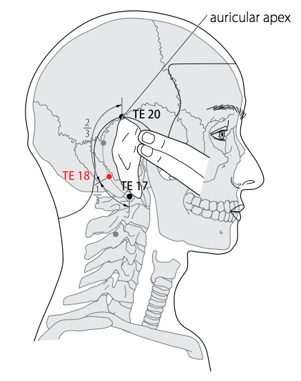 Vent de la tête, douleur rétro-auriculaire 18TR + 12VB Jia Yi jing (Guillaume 1995)