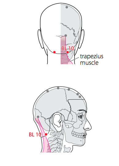- Lu HC 1985 : Location-1: On the posterior hairline behind the neck, on the lateral side of the origin of the trapezius muscle. Location-2: On a level with spinous processes of 1st and 2nd cervical vertebrae, 1.3 cuns from median nape line, on lateral border of eminence of cervical m. How-to-locate-1: With the patient's head bending downward, this point may be located on the lateral side of large tendon and on the side of yamen = D15.