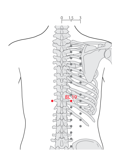 - Lu HC 1985 : Location-1 : 1.5 cuns laterally from the lower end of the spinous process of the 10th thoracic vertebra. Location-2 : On a level with the space between the spinous processes of the 10th and 11th thoracic vertebrae, 1.5 cuns laterally from the posterior median line. How-to-locate-1 : Locate this point 1.5 cuns laterally from the depression below the 10th thoracic vertebra. How-to-locate-2 : Let the patient lie on back, locate this point 1.5 cuns laterally away from the region below the 10th thoracic vertebra.