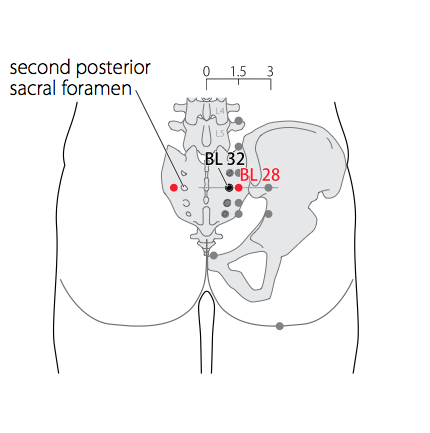 - WHO 2009: In the sacral region, at the same level as the second posterior sacral foramen, and 1.5 B-cun lateral to the median sacral crest. Note: At the same level as BL32.