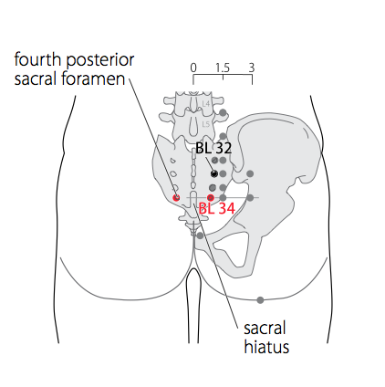 - Lu HC 1985 : Location-1 : On the 4th posterior sacral foramen. Location-2 : On the inferior-medial side of B33, 6 fens away from the posterior median line. How-to-locate-1 : see B31. How-to-locate-2 : see B31.