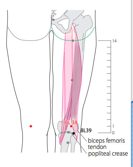- WHO 2009 : On the posterior aspect of the knee, just medial to the biceps femoris tendon, 1 B- cun proximal to the popliteal crease. Note: With the knee in slight flexion, BL38 is located medial to the biceps femoris tendon, 1 B-cun proximal to BL39.