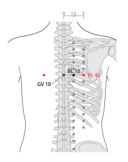 - WHO 2009: In the upper back region, at the same level as the inferior border of the spinous process of the sixth thoracic vertebra (T6), 3 B-cun lateral to the posterior median line. Note: BL45, BL16 and GV10 are located at the same level as the inferior border of the spinous process of the sixth thoracic vertebra (T6).