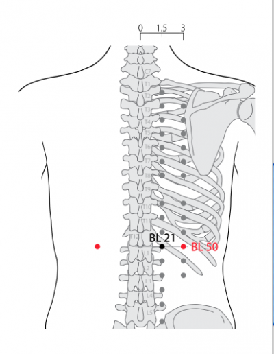 • WHO 2009 : In the upper back region, at the same level as the inferior border of the spinous pro- cess of the 12th thoracic vertebra (T12), 3 B-cun lateral to the posterior median line. Note: BL50 and BL21 are located at the same level as the inferior border of the spinous process of the 12th thoracic vertebra (T12).