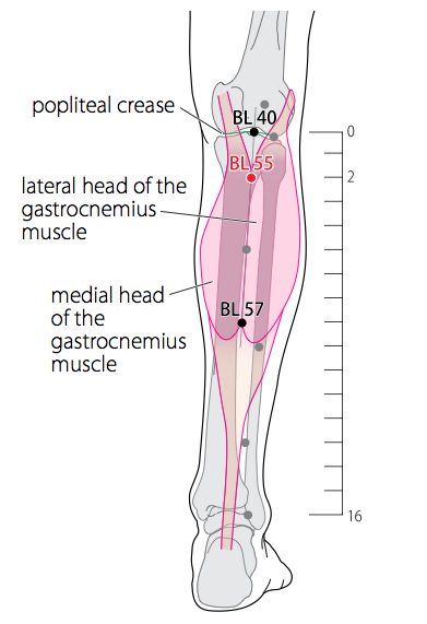 - WHO 2009 : On the posterior aspect of the leg, between the lateral head and medial head of the gastrocnemius muscle, 2 B-cun distal to the popliteal crease. Note: 2 B-cun distal to BL40, on the line connecting BL40 with BL57.