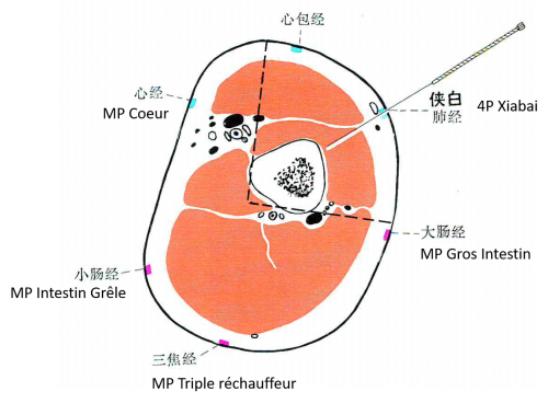 • Pan 1993 : Xiabai se trouve à 1 distance en dessous de Tianfu ( 3P ), au bord radial du biceps.