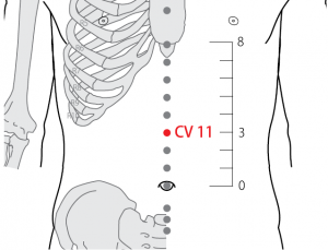 - WHO 2009: On the upper abdomen, 3 B-cun superior to the centre of the umbilicus, on the anterior median line.