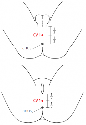 Note: CV1 is located midway between the anus and the genital organ, with the subject lying on the side or in knee-chest position.