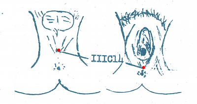 • Ellis 1989 : This point is located halfway between the anterior and posterior yins, the genitals and anus (qian yin, anterior yin, refers to the genitals; hou yin, posterior yin, refers to the anus). Hence it is called Meeting of Yin.