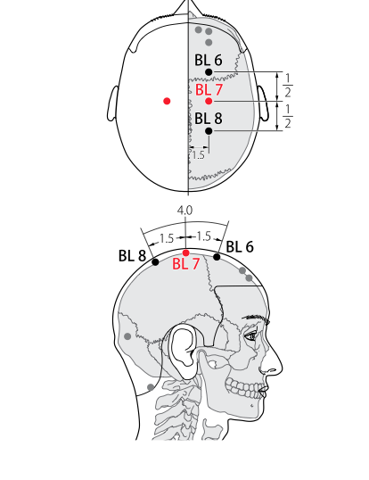 • WHO 2009: On the head, 4 B-cun superior to the anterior hairline, 1.5 B-cun lateral to the anterior median line. Note: Midway between BL6 and BL8.