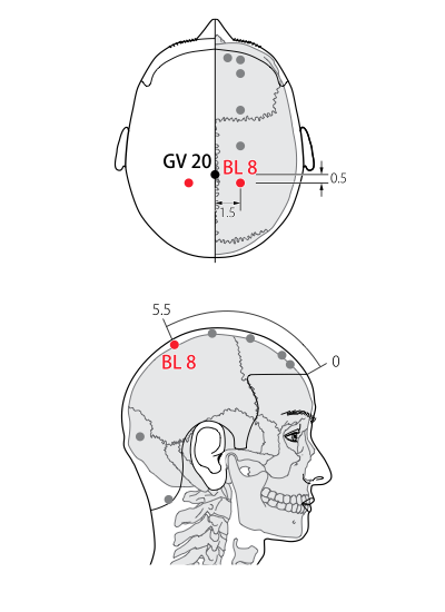 - Lu HC 1985 : Location-1: 1.5 cuns behind Tongtian = B7. Location-2: 1.5 cuns laterally away from sagittal suture, 1.5 cuns behind Tongtian = B7. How-to-locate-1: With patient sitting straight, locate this point straight behind Tongtian = B7, 1.5 cuns laterally from the Du Mai.