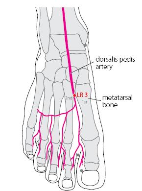 - Pan 1993: Taichong se trouve dans la dépression située en avant du point de jonction des premier et deuxième métatarsiens.