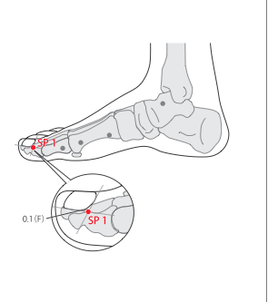 - WHO 2009 : On the great toe, medial to the distal pha- lanx, 0.1 f-cun proximal-medial to the me- dial corner of the toenail, at the intersection of the vertical line of the medial border and horizontal line of the base of the toenail.
