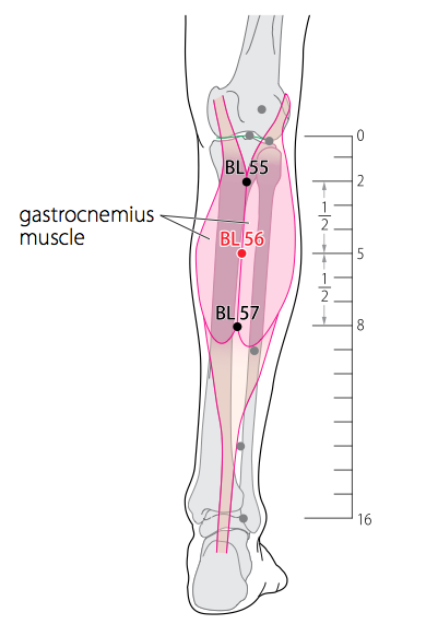 • WHO 2009 : On the posterior aspect of the leg, between the two muscle bellies of the gastrocnemius muscle, 5 B-cun distal to the popliteal crease. Note: Midway between BL55 and BL57.