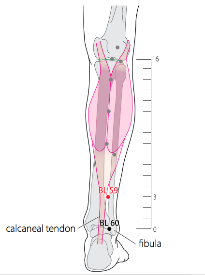 • Lu HC 1985 : Location-1 : 3 cuns above Kunlun = B60. Location-2 : 3 cuns above lateral malleolus. How-to-locate-1 : Let the patient sit straight or lie on side, and locate this point 3 cuns directly above Kunlun = B60.