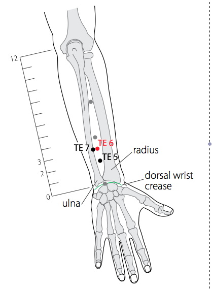 - WHO 2009 : On the posterior aspect of the forearm, midpoint of the interosseous space between the radius and the ulna, 3 B-cun proximal to the dorsal wrist crease. Note: 1 B-cun proximal to TE5, between the radius and the ulna, at the same level as tE7.