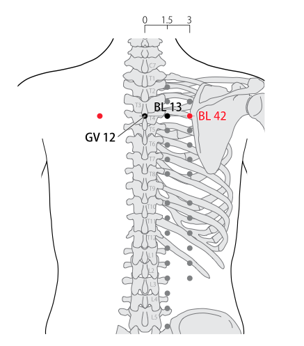 - WHO 2009: In the upper back region, at the same level as the inferior border of the spinous process of the third thoracic vertebra (T3), 3 B-cun lateral to the posterior median line. Note: BL42, BL13 and GV12 are located at the same level as the inferior border of the third thoracic vertebra (T3).